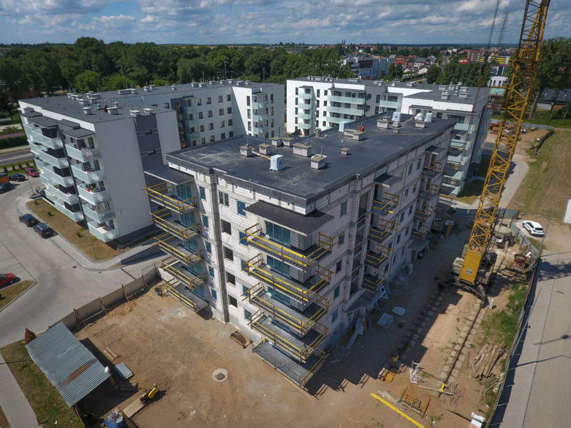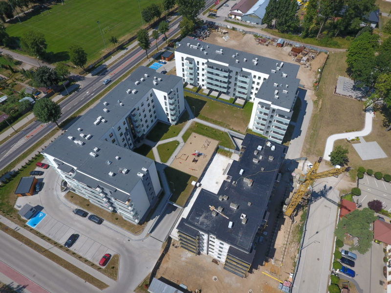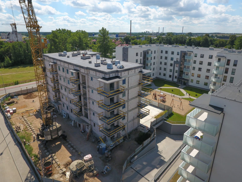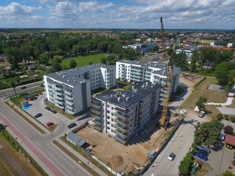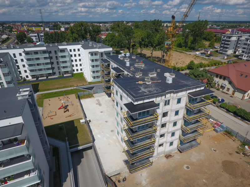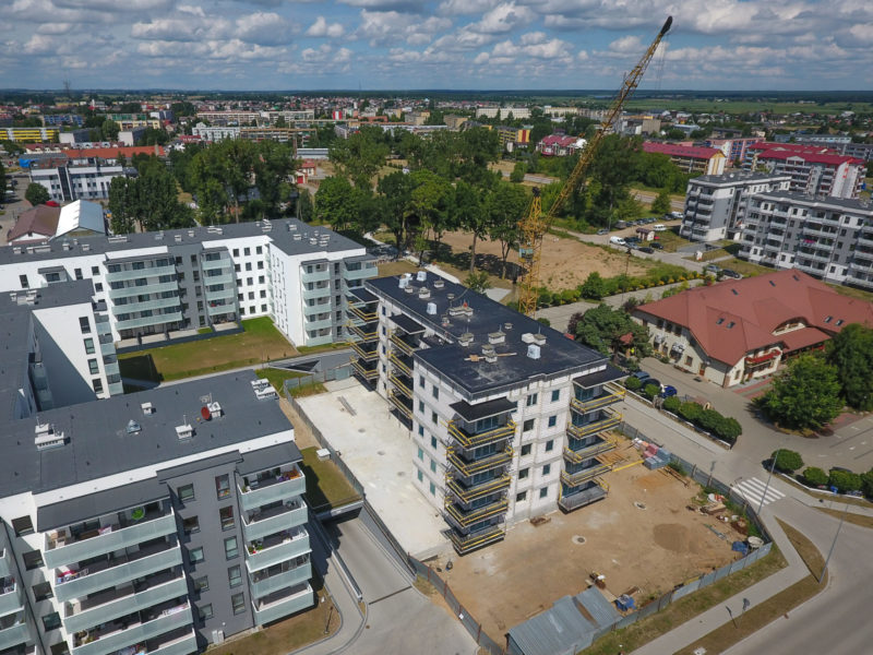 Pogoda tego lata dopisuje i również sprzyja pracom budowlanym. W Grajewie ekspresowo realizowane są kolejne etapy budowy na ul. Tabortowskiego 5. Zakończyliśmy prace konstrukcyjne oraz izolacyjne dachu i balkonów. Wstawiliśmy także większość stolarki okiennej, wkrótce rozpoczniemy prace nad elewacją budynku.