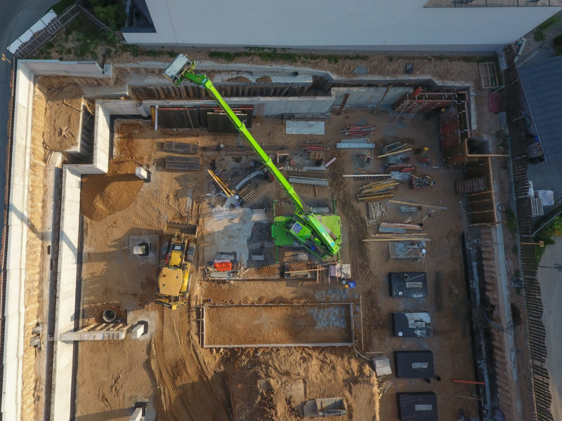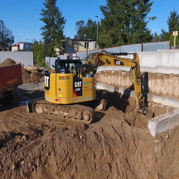 Na Baczyńskiego w Ełku trwa I etap budowy: trwają roboty ziemne oraz stawiane są ściany piwnic i przyszłej hali garażowej.