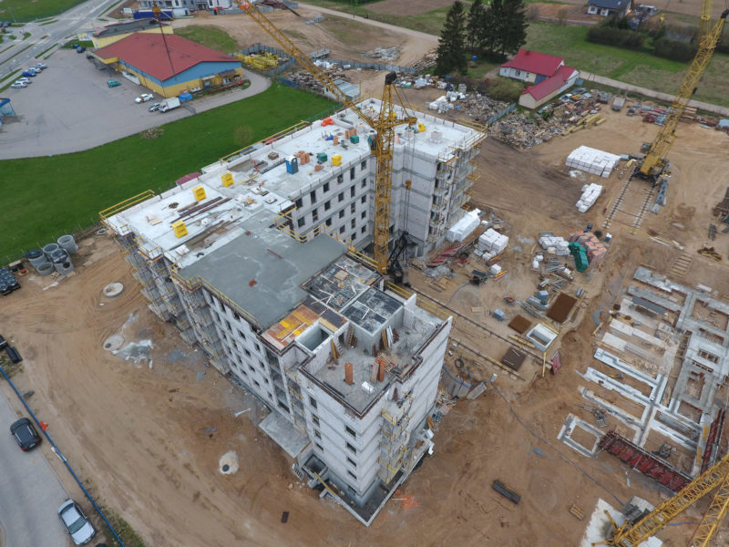 Inwestycja na ul. Nila 6 osiągnęła już planowaną wysokość. Trwają prace nad konstrukcją dachu, kominami oraz wewnątrz budynku stawiane są ścianki działowe. Wkrótce rozpoczną się prace związane z izolacją budynku (materiał jest już na budowie), ze wstawianiem okien oraz z rozprowadzaniem instalacji wewnątrz budynku.
